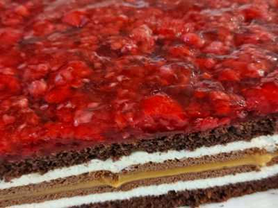 kakaowy biszkopt, kajmak i krem śmietankowy przykryty malinami w galaretce