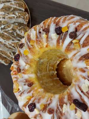 wilgotna babka a`la keks, lukrowana, z dużą ilością bakalii