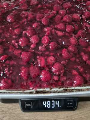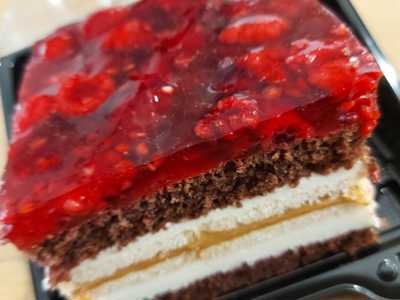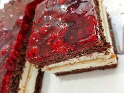 kakaowy biszkopt, kajmak i krem śmietankowy przykryty malinami w galaretce