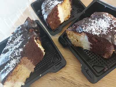 Dwukolorowy biszkopt i krem, kakaowo- waniliowy w intensywnej czekoladowej polewie . Należy kroić po skosie.