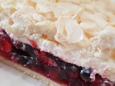 cieniutki biszkopt, owoce leśne w galaretce, bita śmietana i chrupiąca beza